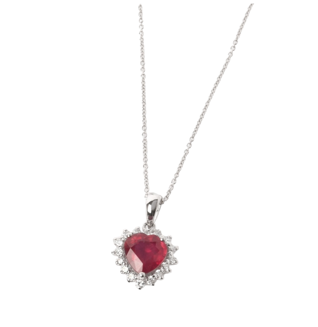 ciondolo in oro bianco 18k e rubino naturale taglio cuore 1,90ct e brilliantini intorno 0,48ct