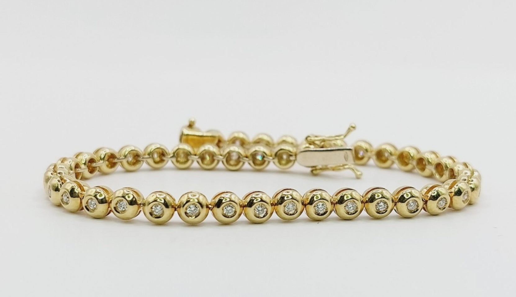 Bracciale tennis con diamanti naturali e montatura a cipollina , composto da una fila unica di diamanti rotondi taglio brillante, che raccolgono luce da ogni lato grazie alla montatura aperta.