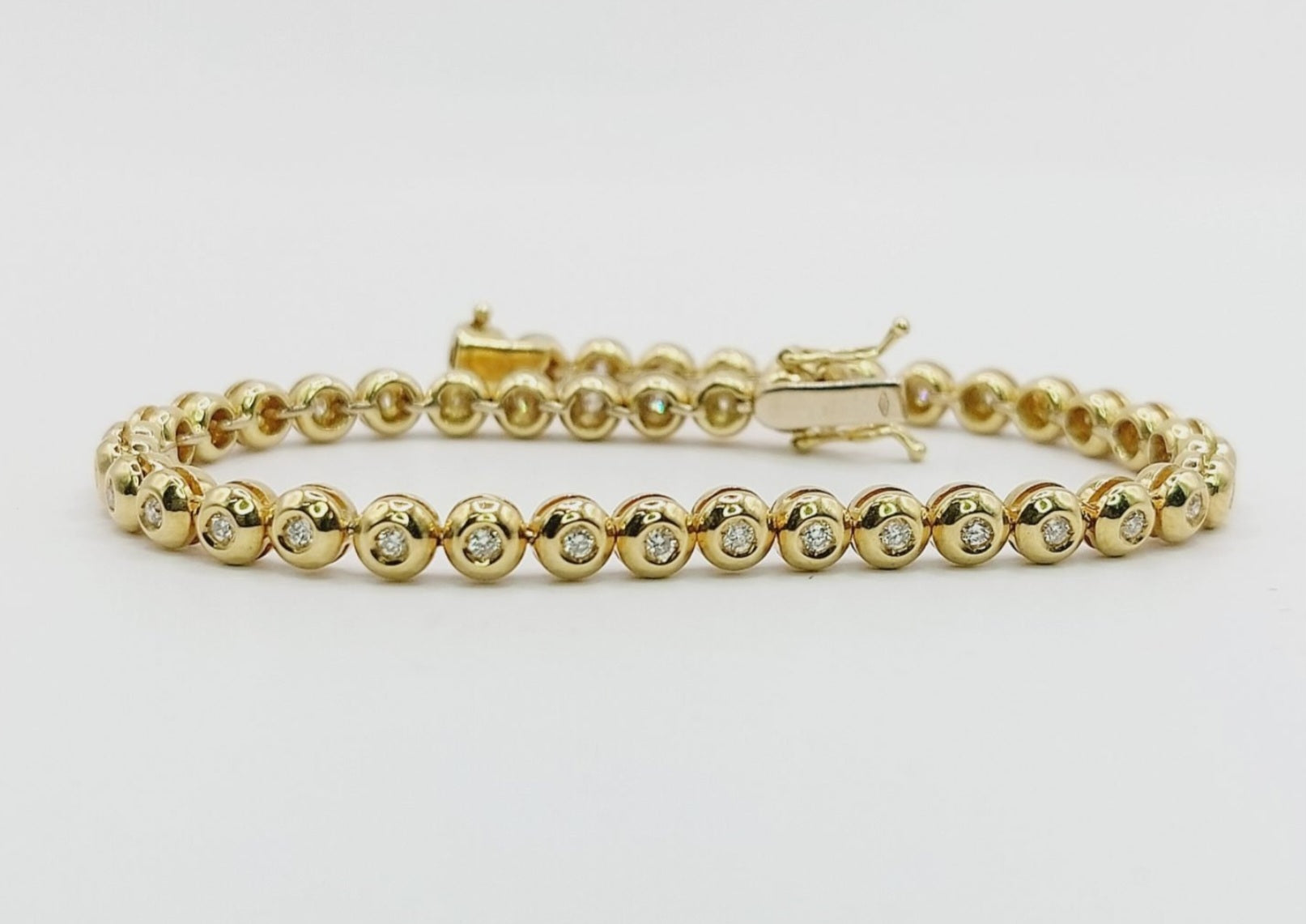 Bracciale tennis con diamanti naturali e montatura a cipollina , composto da una fila unica di diamanti rotondi taglio brillante, che raccolgono luce da ogni lato grazie alla montatura aperta.