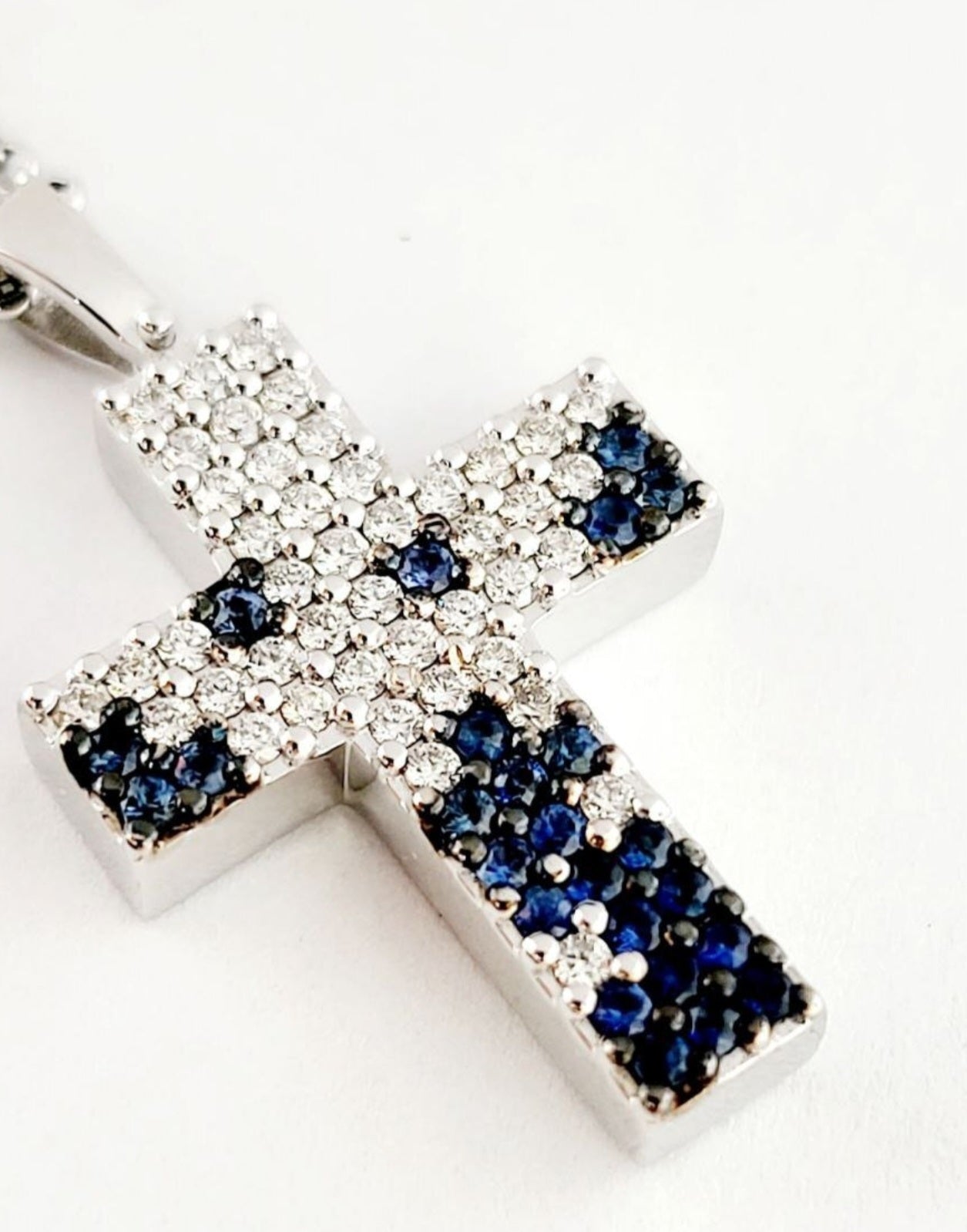 Collana con pendente croce scatola in pave' con Zaffiro Blu ct 1,17 e Diamanti bianchi naturali ct 1,45 lavorato in Oro Bianco 18kt 750/1000- Grammi 7,00