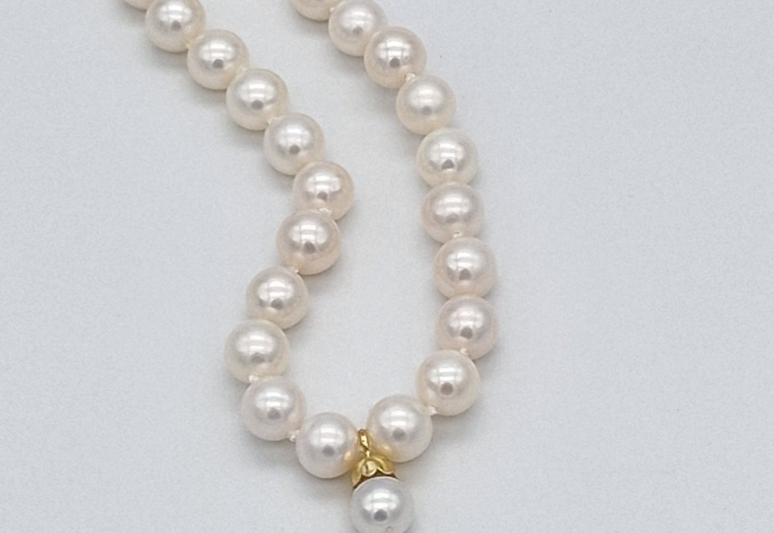 Collana perle akoya da 6.7 a 6.9 mm con pendente oro giallo 18kt e perla akoya da 6.9 mm e chiusura oro giallo 18kt