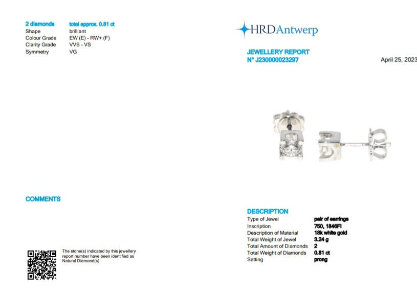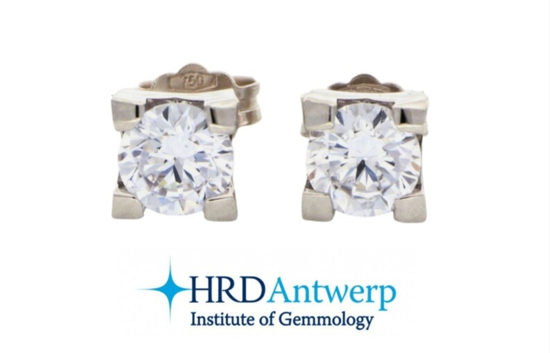 orecchini punto luce quadrato certificato HRD in oro bianco 18k e 2 diamanti naturali 0,81 ct