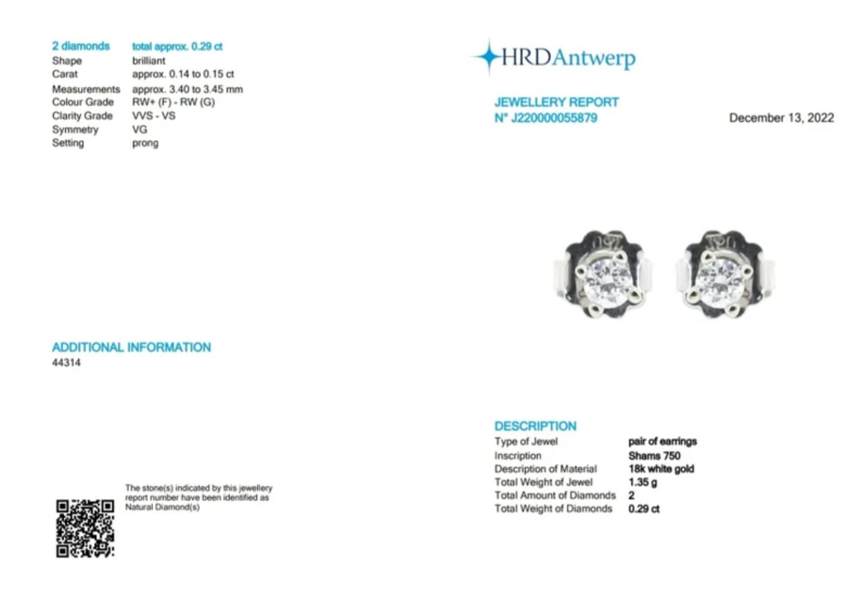orecchini punto luce certificato HRD in oro bianco 18k e 2 diamanti naturali 0,29 ct