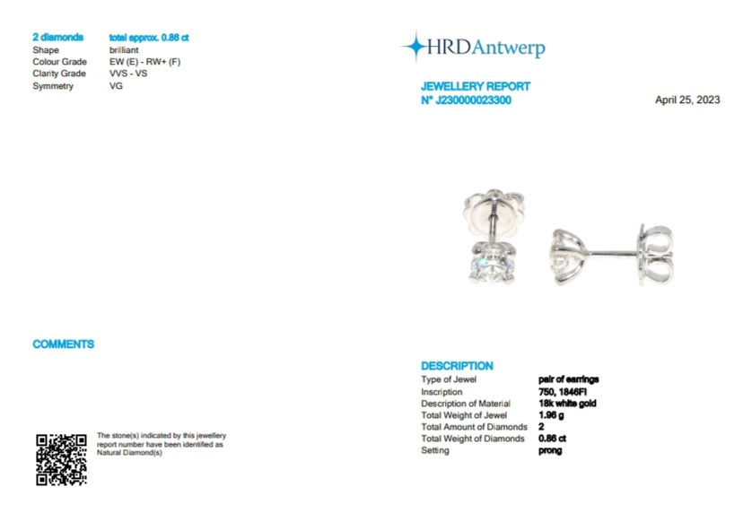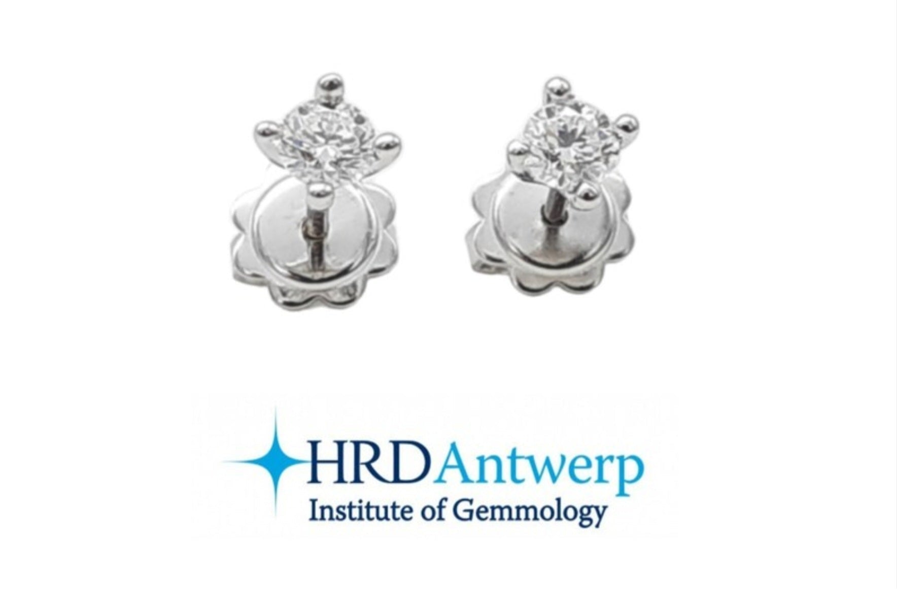 orecchini punto luce certificato HRD in oro bianco 18k e 2 diamanti naturali 0,86 ct