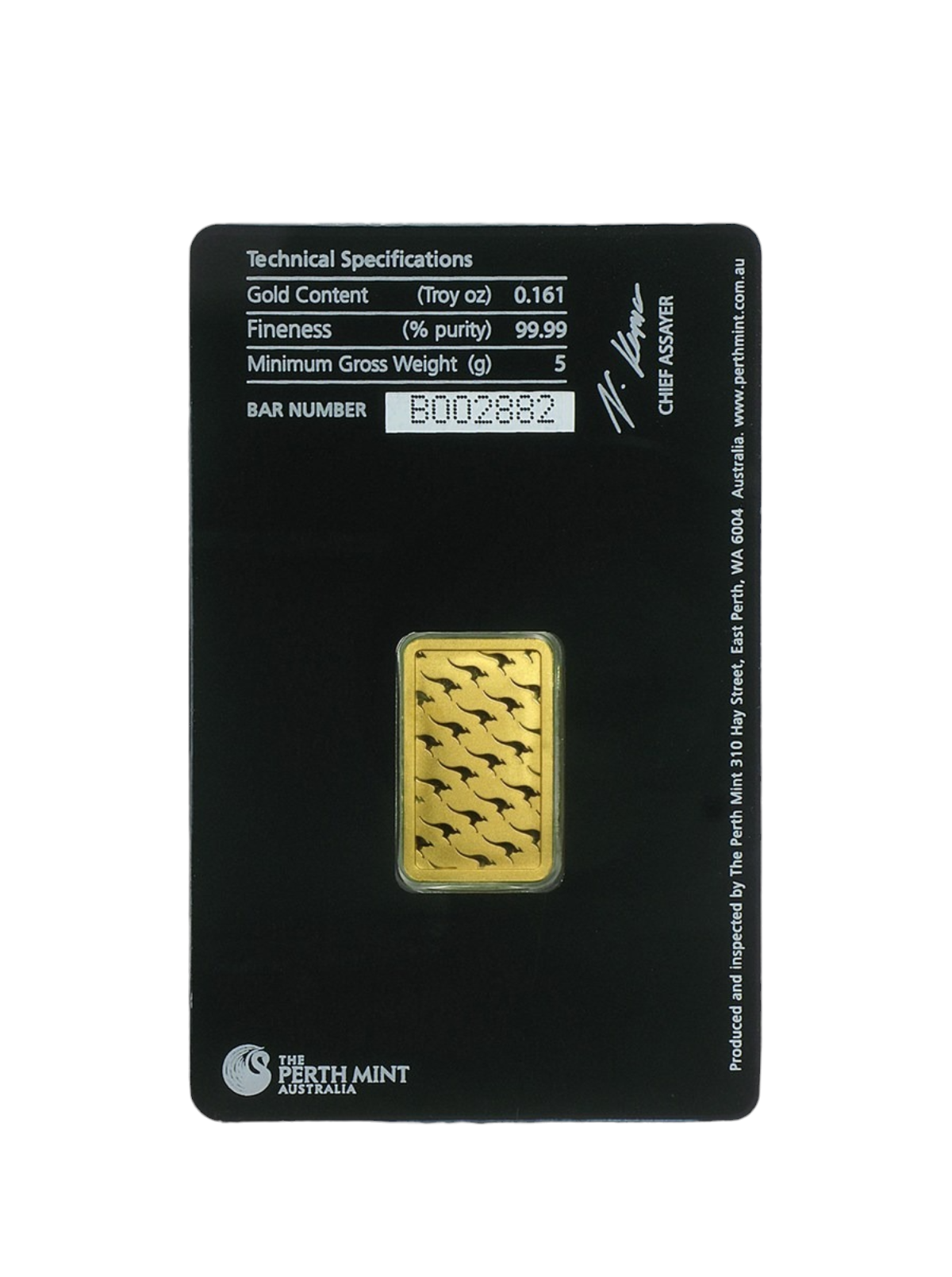 La lingotto d'oro della famosa Perth Mint australiana è l'investimento ideale per i collezionisti di metalli preziosi e per chi è alla ricerca di un rifugio sicuro per il capitale. Ogni lingotto d'oro è coniato meravigliosamente e riporta il magnifico logo con il cigno, un simbolo che rappresenta qualità e purezza. Sotto il logo sono indicati la purezza e il peso del lingotto, mentre sul retro del lingotto si trova un altro classico della zecca di Perth: il motivo seriale con l’iconico balzo del canguro.